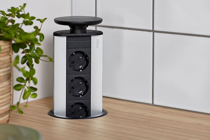 Blandt køkkenets stikkontakter findes også pop-up-versionen. Den fungerer godt, når du vil udnytte pladsen i dit køkken optimalt, og samtidig giver den dig op til tre strømudtag.