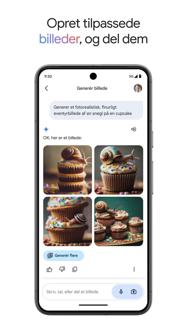 Generér et billede med Gemini – du skal bare skrive din idé. Tænk stort, og del det derefter nemt i Google Beskeder eller Gmail.2