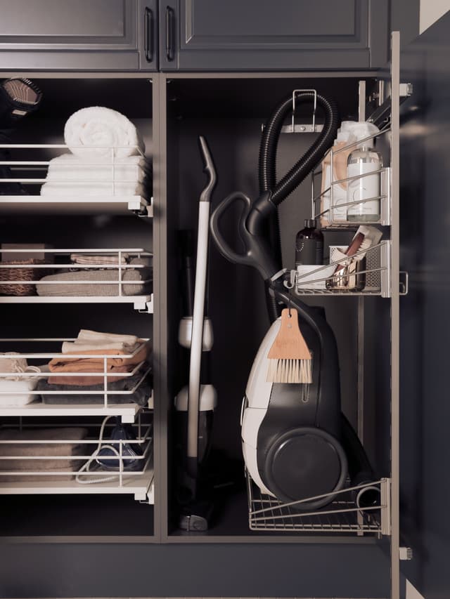 Hvis der er lige vægge, kan du bygge mere i højden og fx opbevare sæsontøj der.Hylder og trådkurve kan placeres højt oppe og skuffer nederst for at sikre god oversigt.