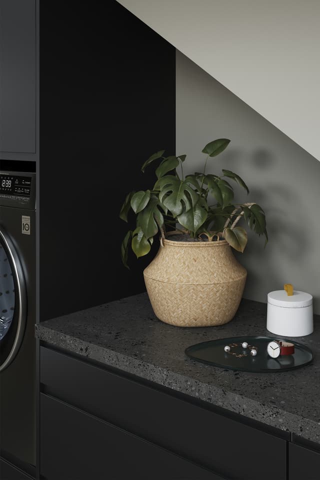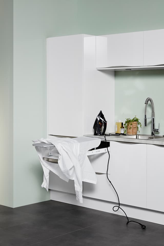 Det giver god mening at opbevare vaskemidlerne tæt på vaskemaskinen, og på samme måde giver det god mening at have en bordplade ved siden af tørretumbleren. Placerer du tørretumbleren oven på vaskemaskinen, sparer du meget plads, men hvis du stiller dem side om side, får du et værdifuldt arbejdsområde ovenpå. Du kan også integrere vaskemaskine og tørretumbler i skabsløsningen. På den måde kommer maskinerne op i en mere behagelig højde, og du kan samtidig udnytte pladsen under dem til skuffer.