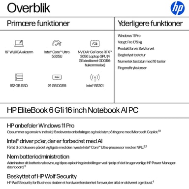 AI-baserede oplevelser og moderne tilslutningsmuligheder øger brugerproduktiviteten. HP EliteBook 6 G1i AI 16" PC har en 11 TOPS NPU[3], sikkerhed i virksomhedsklassen og håndterbarhed i en yderst konfigurerbar pc, der opfylder virksomhedsbrugernes krævende krav.