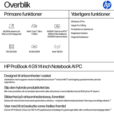 HP ProBook 4-Notebook G1ipå 14" giver virksomheder i vækst ydeevne i erhvervsklassen, avanceret endpoint-sikkerhed i flere lag[6] og robusthed i et design, der nemt kan opgraderes. Den funktionsrige pc, der er drevet af den nyeste Intel-processor[2] med 11 TOPS NPU[4] og lang batteritid, er fremtidssikret til langsigtet produktivitet og AI.