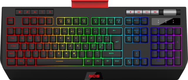 Dette NOS K-600 CORE RGB gaming keyboard hæver din gaming til det næste niveau. Det er forsynet med multimedietaster, Fn-lag og 25 key anti-ghosting-funktion. Det er desuden forsynet med RGB-lys, som kan indstilles til flere forskellige flow-effekter, så du kan tilpasse tastaturet til dit humør. Det er desuden udstyret med en telefonholder.
