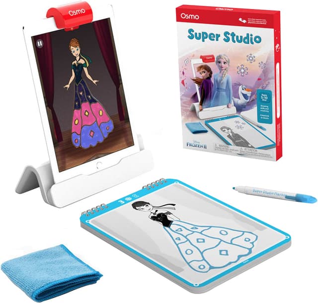 Osmo Super Studio Frozen 2 tilbehørssættet gør det muligt for børn at udforske deres tegneevner i et miljø af Disney-historier. Sættet indeholder en base, der understøtter et udvalg af iPads samt Super Studio Game App, Sketchpad, Studio Marker og Sweeper, så børnene kan starte med at tegne. Få feedback på tegningerne, se dem komme til live og overfør dem til din enhed,