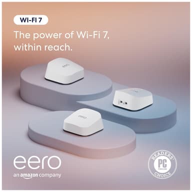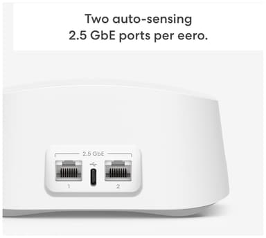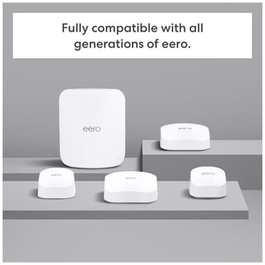 eero 7 BE1800 WiFi 7 mesh-routeren leverer pålidelig 2,5 Gbps kablet hastighed og 1,8 Gbps trådløs hastighed med op til 190 m2 dækning. TrueMesh-teknologien eliminerer døde zoner og sikrer stabil forbindelse i alle rum.Læs mere om produktet
