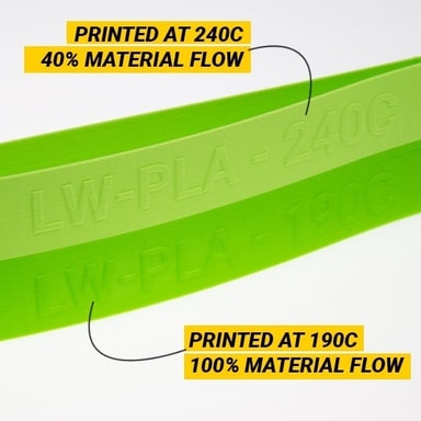 LW-PLA er det første filamentet i sitt slag: et 3D-utskriftsfilament som ved hjelp av aktiv skummingsteknologi oppnår lette, printede deler med lav tetthet. På rundt 230C begynner LW-PLA å skumme, og det øker volumet med nesten 3 ganger. Ved å redusere materialstrømmen (flow) med 60% kan du oppnå lette deler. Man kan også bruke de ekspanderende egenskapene for å redusere utskriftstiden ved å skrive ut store laghøyder eller ekstra tykke materialer. Finjustering og optimalisering er nødvendig for å få mest mulig ut av LW-PLA.LW-PLA er ditt valgte materiale der vekten betyr noe, som å skrive ut RC-fly, droner og til cosplayformål.