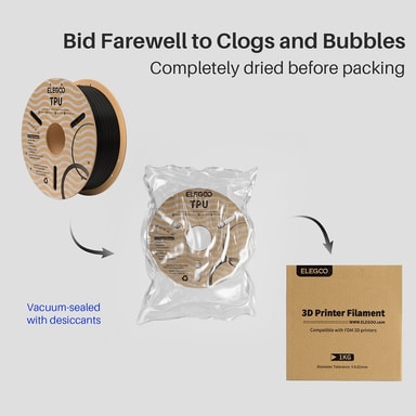 Høykvalitets TPU fra Elegoo som er enkel å printe med. Filmentet er pent spolet opp på rullen som sikrer at man unngår floker/knuter under printing.Læs mere om produktet