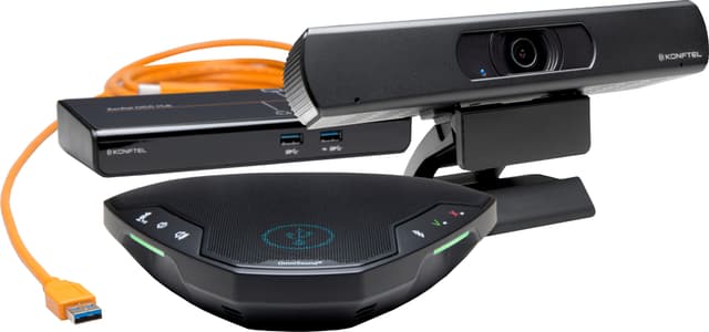 Med denne hub kan du slutte højttalertelefonen, webkameraet og skærmen til den og derefter tilslutte hub`en med et kabel til din bærbare computer. Dette modvirker kabelføringer og understøtter BYOC (medbring din egen computer), da alt hvad du behøver for at bruge konferencepakken er en bærbar computer (enhver), der opretter forbindelse via et USB-kabel.