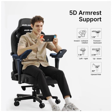De fuldt justerbare 5D-armlæn tilbyder en bred vifte af bevægelser, herunder opadgående foldning, indad-udad rotation samt op-ned, venstre-højre og frem-tilbage glidning. Denne fleksibilitet giver optimal arm- og albukomfort og imødekommer forskellige gaming-stilarter og præferencer.