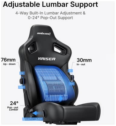 Stolen har et 4-trins udskydelig lændestøttesystem, der giver 3°-24° omfattende støtte til forskellige siddestillinger. Med 76 mm op-ned og 30 mm ind-ud justeringer giver den en naturlig tilpasning til rygsøjlen, fremmer bedre holdning og reducerer belastning under lange timers gaming.