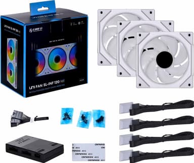 Lian Li UNI FAN SL INF 120mm RGB blæseren kører op til 2100 RPM for effektiv køling. Den er udstyret med 40 kraftige RGB LED'er. Og takket være det magnetiske fluid dynamic bearing (FDB), kører den jævnt og støjsvagt med lang levetid.Læs mere om produktet