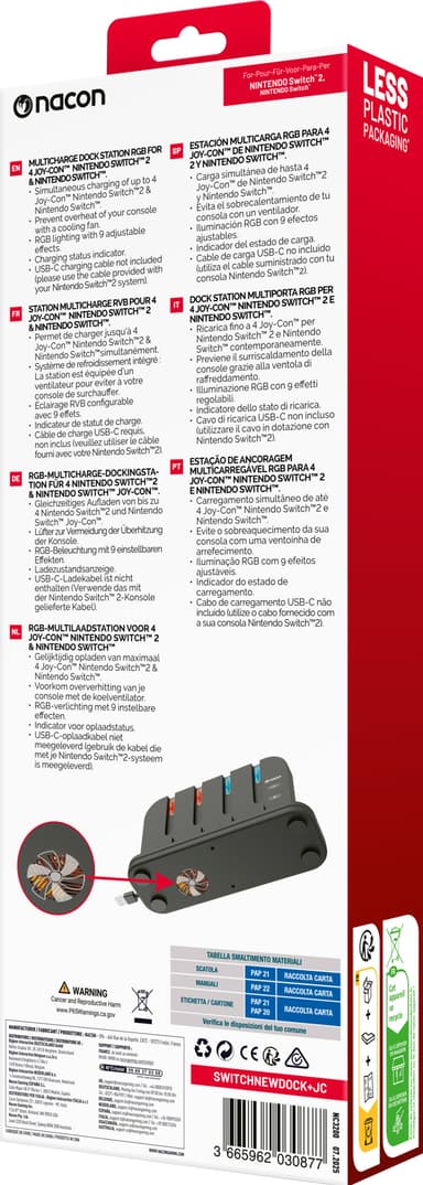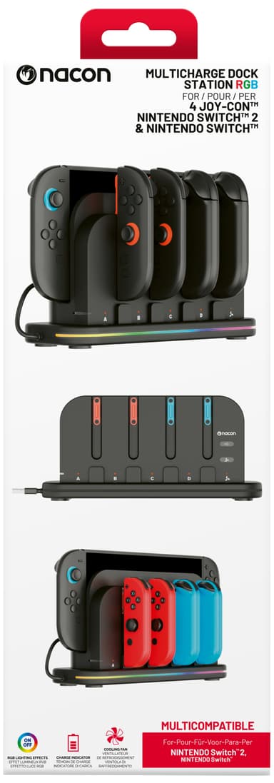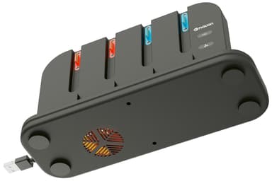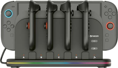 Denne Nacon Switch 2 og controller opladningsdok lader dig oplade din Nintendo Switch/Switch 2 og op til fire JoyCon controllere. Den har RGB-belysning, konsol køleblæser og USB-strømtilslutning for hurtig opladning.Læs mere om produktet