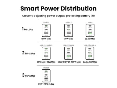 1 port udgang: USB-C1 100W, USB-C2: 30W, USB-A 22,5W