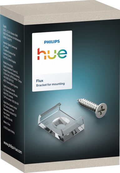 10-pakken med Hue Flux SL beslag bruges til sikkert at fastgøre Philips Hue lysstriber på vægge, lofter, hylder eller møbelkanter. Klik blot beslagene på plads, klik lysstriben fast i dem, og placer striben pænt, hvor du ønsker konsekvent, rent lys.