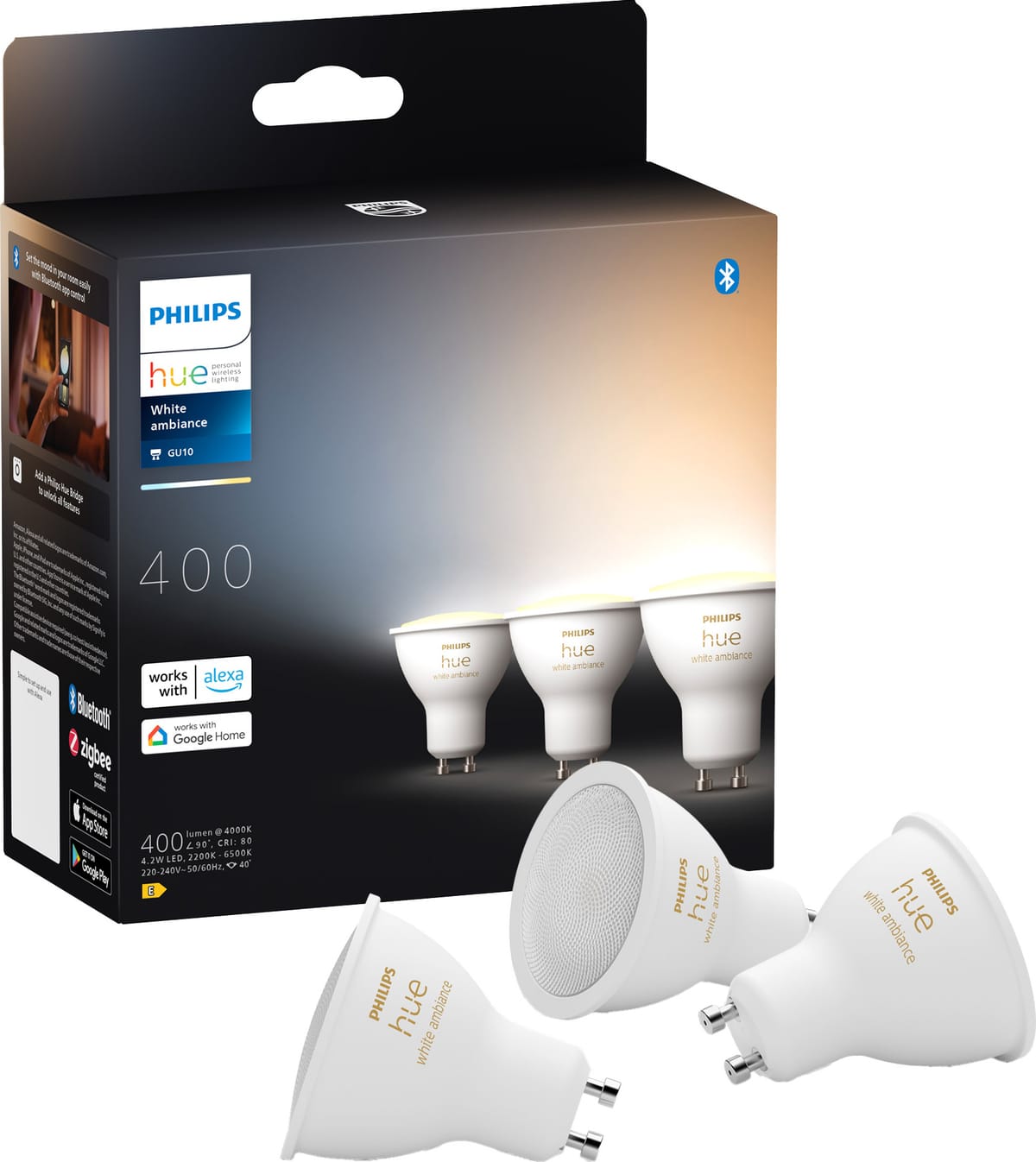 Philips Hue White Ambiance 4,2W GU10 LED-lys (pakke med 3) er designet til spotlys. Disse dæmpbare pærer tilbyder justerbare hvide lystoner, som nemt kan styres via Philips Hue-appen eller dit smarte hjemmesystem ved hjælp af stemmekommandoer.Læs mere om produktet