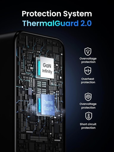 Produktet er udstyret med Thermal Guard 2.0 og GaN teknologi, som giver det en meget god ydeevne og fremragende beskyttelse mod overspænding, kortslutning, overstrøm og overophedning.