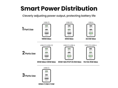 2 porte udgang, USB-C1: PD 65W + USB-C2: PD 30W: USB-C1: PD 65W + USB-A: 18W: USB-C2: 7,5W + USB-A: 7,5W