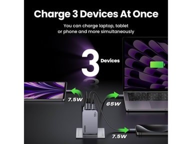 3-ports udgang, USB-C1: PD 65W + USB-C2: 7,5W + USB-A: 7,5W