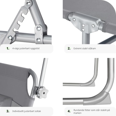 De 4-positions-justerbare ryglæn tillader dig at tilpasse din solseng efter dine præferencer, fra oprejst læsning til fuld liggeposition til en lur under solen. Uanset om du foretrækker at ligge fladt eller sidde op, giver denne fleksibilitet dig kontrol over din komfortoplevelse. Den aftagelige hynde til hovedet tilføjer et ekstra lag af luksus, så du kan hvile med optimal støtte.