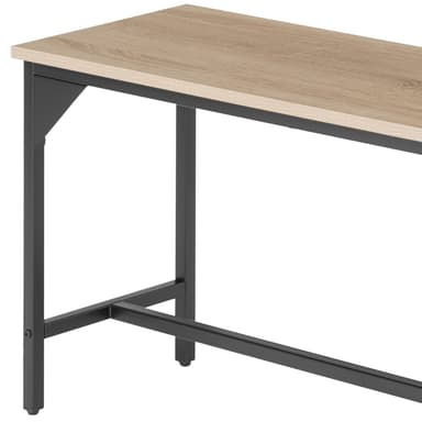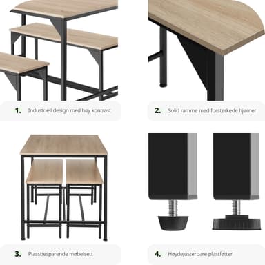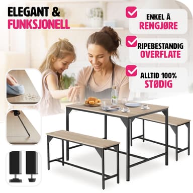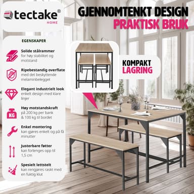 Dette indendørs bord bænkesæt fra tectake passer ind i enhver indretning. Det lineært designede spisestuesæt imponerer med det stilrene årer i trælook og det pulverlakerede stål i sort, som skaber en æstetisk kontrast. Den beskyttende melaminbelægning på dette bord bænkesæt gør MDF-pladerne lette at rengøre overflader modstandsdygtige over for ridser, væsker og andre påvirkninger. Hvis det alsidige bord bænkesæt ikke bliver brugt, kan bænkene praktisk talt skubbes ind under bordet - et smagfuldt statement til enhver lejlighed: den elegante indendørs bordbænkesæt fra tectake.