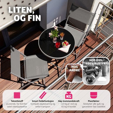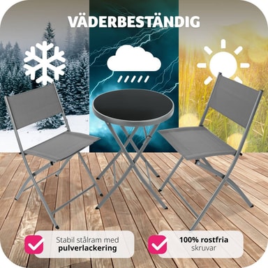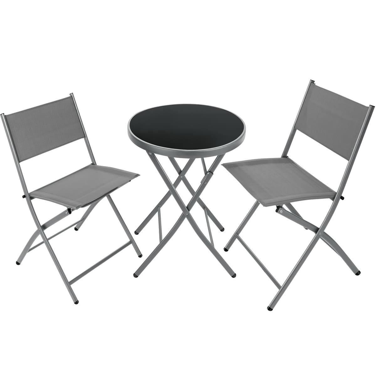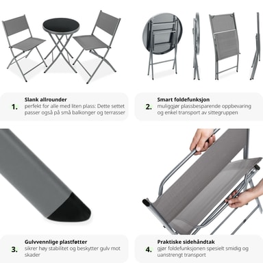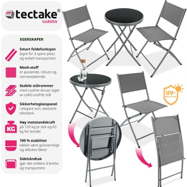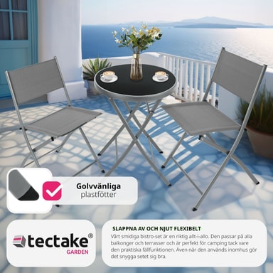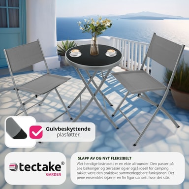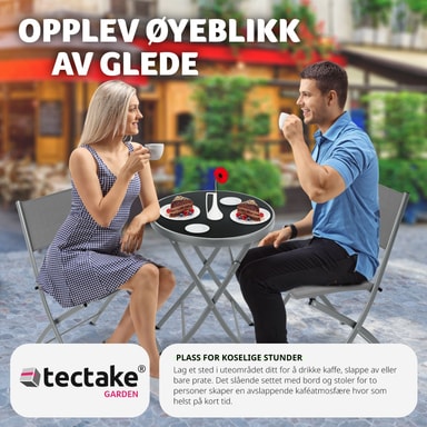 Skab en behagelig hyggeplads med det funktionelle cafésæt fra tectake. De slidstærke tekstilfibre skaber en åndbar siddeoplevelse og giver derfor en behagelig, kølig følelse, også på varme dage. Den mest fantastiske egenskab ved dette cafésæt er fleksibiliteten: Man kan samle og skille det ad i en håndevending. Den lave vægt og funktionen, som muliggør, at det kan klappes sammen, gør også dette møbelsæt velegnet som altanmøbler. Stellet af stål, som er meget robust, giver tillige en høj grad af stabilitet til siddegruppen. Det vedligeholdelsesvenlige cafésæt fra tectake: klap ud, tag plads og nyd!
