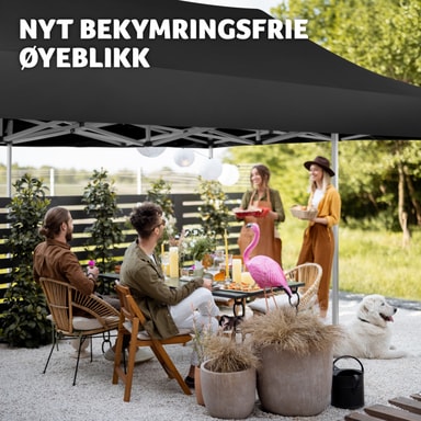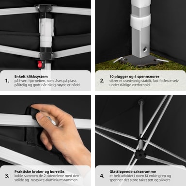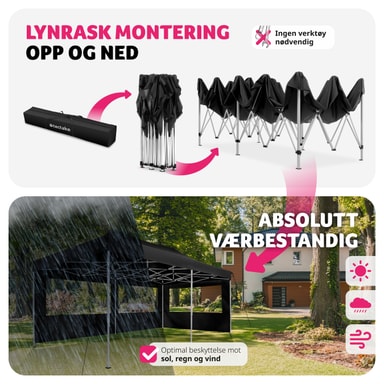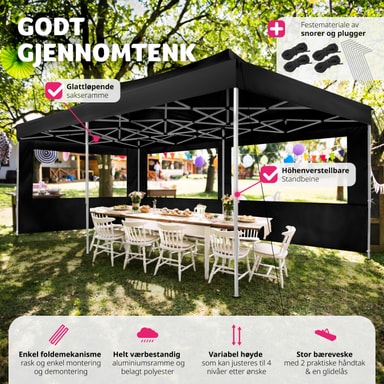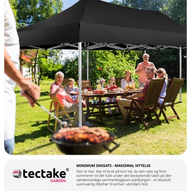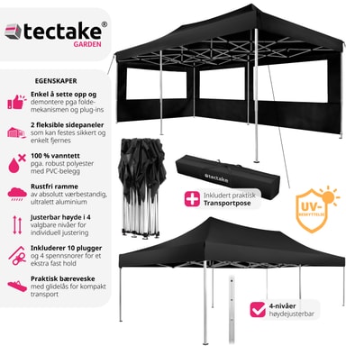 Denne Easy up pavillon med 2 sidestykker er kendetegnet ved at være hurtig og enkel at sætte op. Pavillonen har et saksestel, som bare skal trækkes ud for at teltet bliver klar til brug. Højden på det rustfri stel og den vandtætte pavillon kan justeres efter behov. Da den er lige så nem at slå ned igen, som den er at sætte op, undgår du skader på pavillonen, når den pakkes sammen. Når pavillonen skal transporteres eller opbevares, kan den pakkes ned i den tilhørende taske. En smart løsning til udendørs sammenkomster: Den alsidige Easy up pavillon fra tectake.