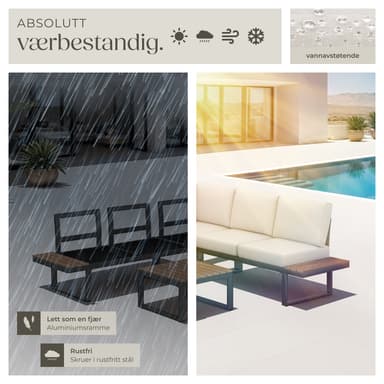 Den rummelige siddegruppe imponerer ikke kun med sit udseende, men takket være den robuste, rustfri aluminiumsramme også med en førsteklasses stabilitet og vejrbestandighed. Om det er sommervarme, regn eller kølig efterårsvind – dette sæt tåler alle vejrforhold! De højdejusterbare udligningsskruer med gulvskånende og skridsikre plastkapper sikrer desuden absolut stabilitet på enhver overflade, uanset om det er på ujævnt græs eller glatte terrassefliser.