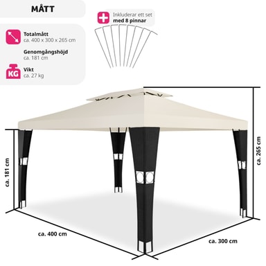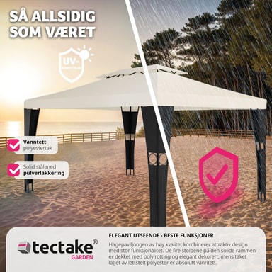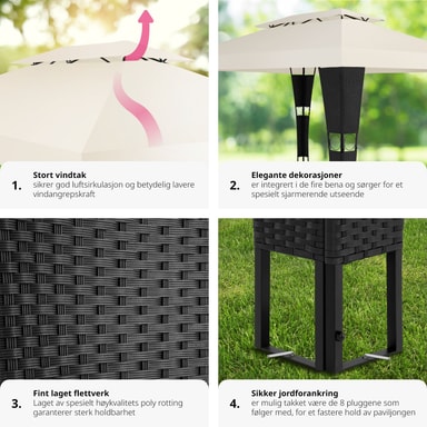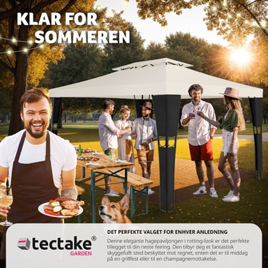 Lad haven forvandle til en wellness-oase med en æstetisk havepavillon i polyrattan fra tectake. Nyd de varme dage, lyse sommeraftener og hyggelige havefester under det vandafvisende tag på pavillonen, der skærmer for solen. Det påsatte tag på toppen lader varmen slippe ud og sørger for ventilation af frisk luft. Den pulverlakerede stålramme er beklædt med polyrattan og pyntet med ornamenter. Tryl en følelse af sydlandsk feriestemning frem i haven med den flotte havepavillon i polyrattan fra tectake.