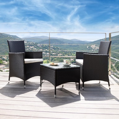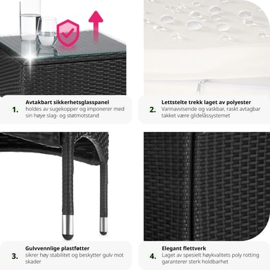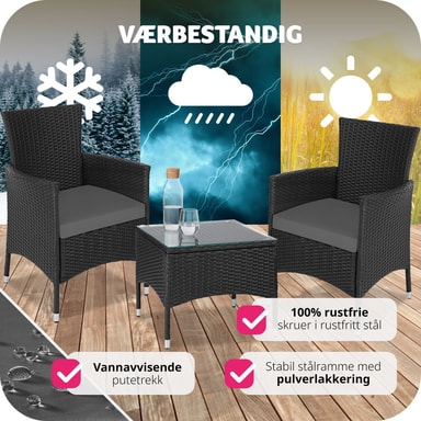 Om det er på altanen, terrassen eller i haven: Med et polyrattan havemøbelsæt Bern fra tectake kan man nyde sommeren på bedste vis derhjemme. Havemøbelsættet med to stole og et lille bord med glasplade behøver på grund af sin kompakte udformning ikke megen plads og den kan nærmest stilles op overalt. Hynderne af polyester er afstemt fint med polyrattansættets farver. Det smarte sæt forener en behagelig siddekomfort med minimal vedligeholdelse. Desuden medfølger der også et ekstra sæt hyndebetræk til havemøbelsættet. Overfladen er imprægneret for at beskytte hynden mod fugt - snavs og vanddråber preller simpelthen af. Slap af uden bekymringer i dit polyrattan havemøbelsæt fra tectake.