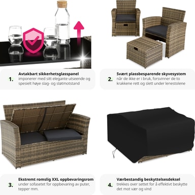 Opbevaring bliver en leg med det rummelige rum under sofaens sæder, ideelt til at gemme tæpper eller puder. Bordet, som inkluderer en aftagelig plade af sikkerhedsglas og en praktisk hylde, tilbyder både stil og funktionalitet. For at skåne dine gulve er sættet udstyret med plastfødder, og den nemme rengøring og enkle konstruktion gør vedligeholdelse til en fornøjelse.