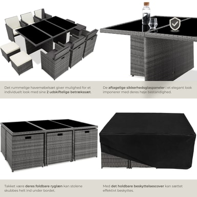 Bygget med holdbare materialer, er dette havemøbelsæt både robust og vejrbestandigt. Polyrattan materialet er kendt for sin holdbarhed og modstandsdygtighed over for vejrets luner, hvilket betyder, at dine møbler forbliver flotte sæson efter sæson. Det medfølgende beskyttelsesovertræk giver ekstra beskyttelse mod regn og UV-stråler, hvilket sikrer, at dit sæt altid ser nyt ud.