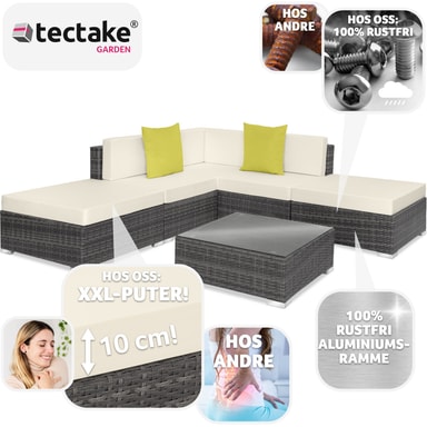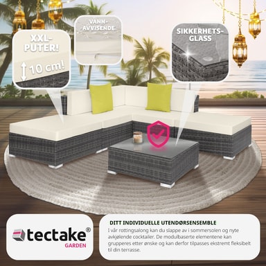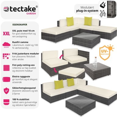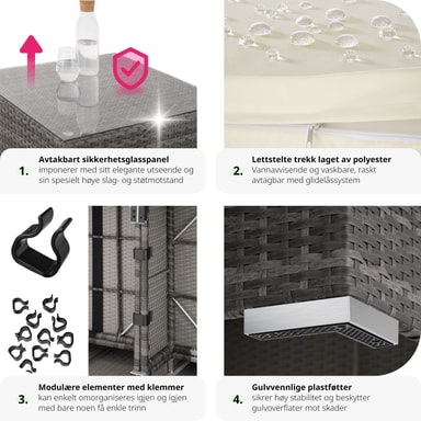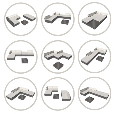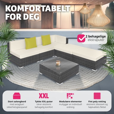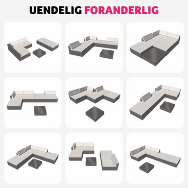 Et af de mest unikke aspekter ved vores loungesæt er dets modulopbygning. De forskellige elementer kan arrangeres efter din smag og pladsbehov, hvilket giver dig frihed til at skabe din egen ideelle udendørs oase. Forbindelsesklemmerne, som medfølger, sikrer en stabil og sikker opstilling, uanset hvordan du vælger at placere dine møbler.