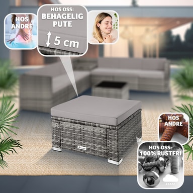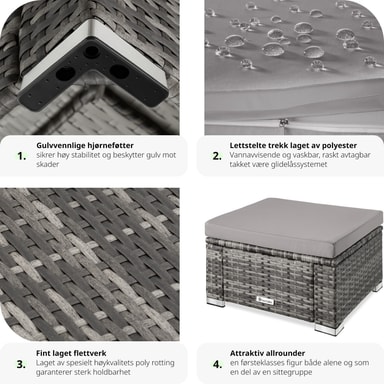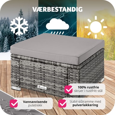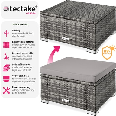 Pryd haven eller terrassen med den praktiske og stilfulde puf i polyrattan. Denne puf fra tectake er et blikfang til din udendørs område - enkeltstående eller som en del af eksisterende Polyrattan sæt. Hverken sol eller regn bider på den vedligeholdelsesvenlige konstruktion af Polyrattan og skruer i rustfrit stål. Den store, tykke hynde passer perfekt i farven med denne puf. For at beskytte mod fugt er puffens overflade imprægneret. På grund af højden egner denne puf sig også ideelt som bord til at stille drink eller bøger på. Forkæl dig selv med lidt afslapning og læg benene op på den behagelige polyrattan puf fra tectake.