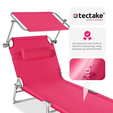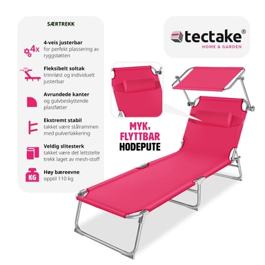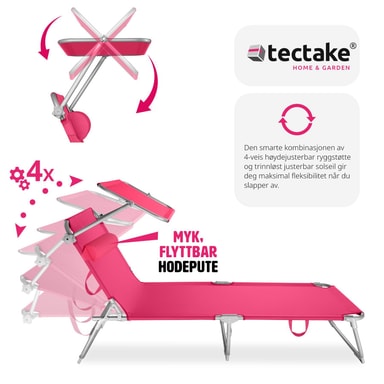 For den maksimale sommernydelse kombinerer denne alsidige solseng fra tectake høj funktionalitet med et robust design. Det 4-trins justerbare ryglæn, det fleksibelt indstillelige soltag, den bløde hovedpude og den behagelige liggeflade garanterer maksimal afslapning i denne liggestol. Det pulverlakerede trebens-stålstel giver den vedligeholdelseslette konstruktion ekstrem stabilitet og stor vippebeskyttelse. Den enkle klapmekanisme, de ideelle sammenklappede mål og de praktiske håndtag gør den lette solseng fra tectake ideel at tage med på farten. Denne solseng er herudover nem at opbevare.