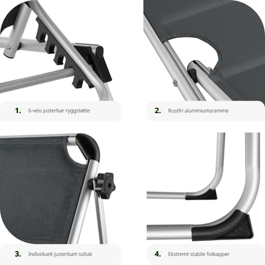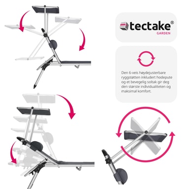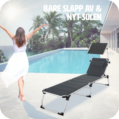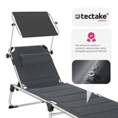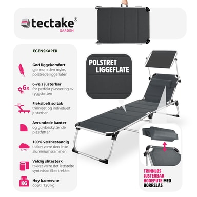 Sikr dig den bedste plads i solen, med den funktionelle liggestol Lorella fra tectake. Den stabile aluminiumsramme og det slidstærke betræk garanterer maksimal stabilitet og stor holdbarhed. Takket være den gennemtænkte foldemekanisme og den lave vægt, kan foldesengen let transporteres med dens praktiske bærehåndtag og er let at opbevare. Ryglænet, som kan justeres i seks trin, den behagelige hovedpude og det justerbare solsejl gør, at feriefølelsen er i top på liggestolen.