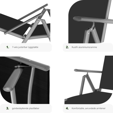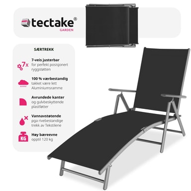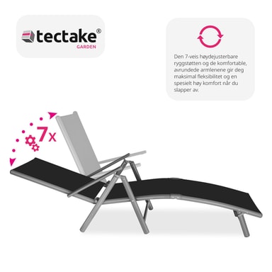 Med den moderne og funktionelle solseng fra tectake ligger du altid godt. Ryglænet kan justeres i syv trin, og det luftgennemtrængelige stof, der former sig efter kroppen, gør det nemt at slappe af.Læs mere om produktet