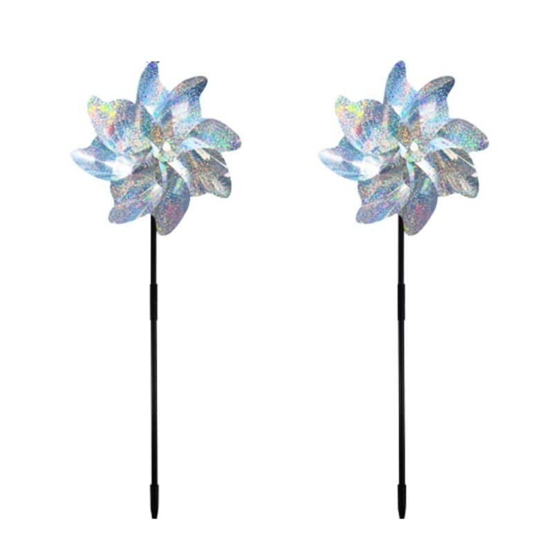 Sæt med reflekterende vindspindere, der også fungerer som fugleskræmsler. Sad fast i jorden og snurrer derefter i vinden og reflekterer sollys, skræmmer fugle væk uden at skade dem. Spinnerne er også en fin dekoration på altanen eller i haven.