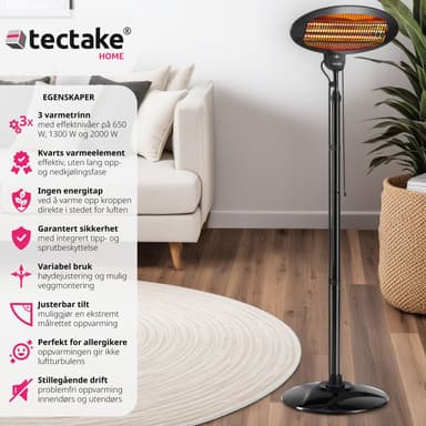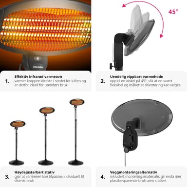 Den innovative infrarøde teknologi muliggør en målrettet varmefordeling, der virker direkte på kroppe og objekter i omgivelserne, uden at opvarme luften. Det betyder, at du nyder øjeblikkelig varme, så snart du tænder for apparatet. Med en effekt på op til 2000 watt er denne varmelampe ikke kun kraftfuld, men også yderst energieffektiv.
