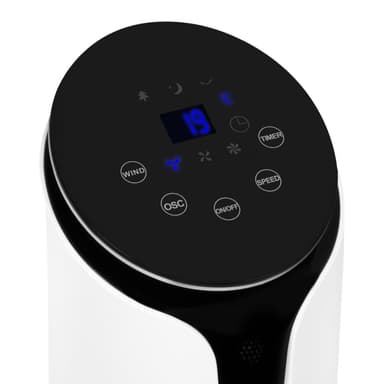 Denne slanke tårnventilator vil være et cool og stilfuldt blikfang i dit hjem. Det moderne designede kontrolpanel er udstyret med et LED-display og behagelige touch-knapper. Der er 3 hastighedsindstillinger (blød, medium, hård) og en timer på 15 timer. Swing-funktionen giver en gradvis fordeling af kølig luft. Denne ventilator leveres komplet med fjernbetjening, så du kan styre indstillingerne overalt. Fin detalje: Der er et praktisk opbevaringsrum i tårnet, hvor du kan placere fjernbetjeningen.