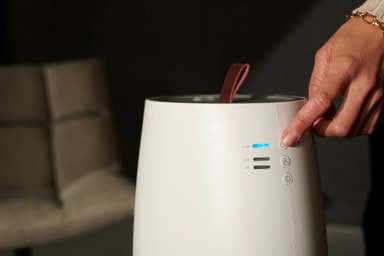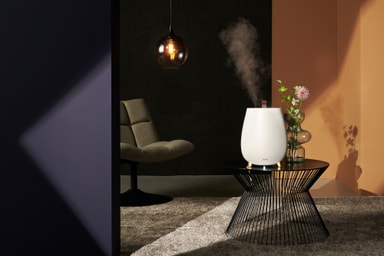 Denne TAG 2 luftfugter har et rundt design med træben og et lædermærkat ovenpå og vil være en stilfuld tilføjelse til dit værelse og din stue. Placer luftfugteren på en skænk eller et bord, så tågen kan absorberes godt af den omgivende luft for at få de bedste resultater.