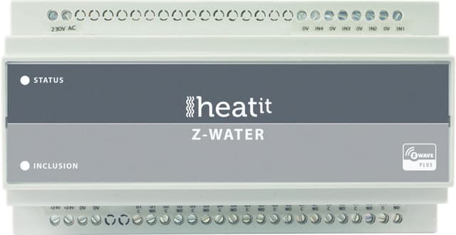 Heatit Z-Water Regulator til vandbaseret varmesystem er et godt redskab til brug til eksempelvis styring af aktuatorer i vandbåren gulvvarme. Den monteres med klips på en DIN-skinne og kan fungerer som Z-Wave repeater til omfattende dækning af Z-wave netværk. Den er udstyret med 10 relay outputs og 4 analoge inputs. Modulet strømforsynes fra en 230V AC hovedenhed og kan levere outputforsyning til 24 V DC eller 230V.