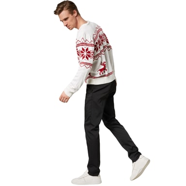 Den tofarvede julesweater Winterland til mænd med rødt motiv på hvid baggrund spreder en romantisk stemning. Fin dobbeltstrik gør, at den er varm og meget behagelig at have på.Læs mere om produktet