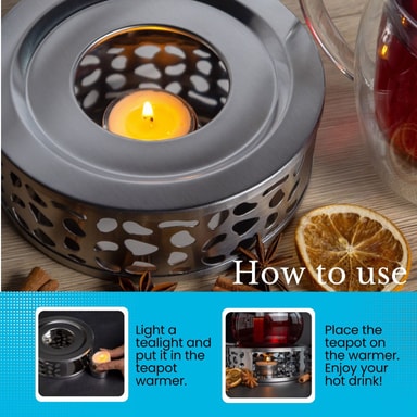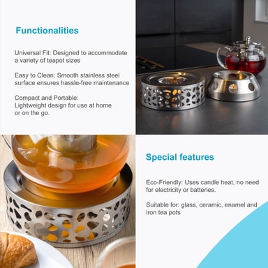 Det er en leg at holde mad og drikke varmt med denne praktiske tekandevarmer. Det er et energibesparende alternativ til mikrobølger og komfurer, fordi du ikke behøver andet end et fyrfadslys! Tekandevarmeren kan kombineres med mange tekander - du kan også finde matchende tekander i vores butik!
