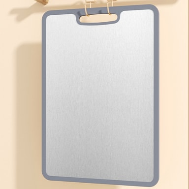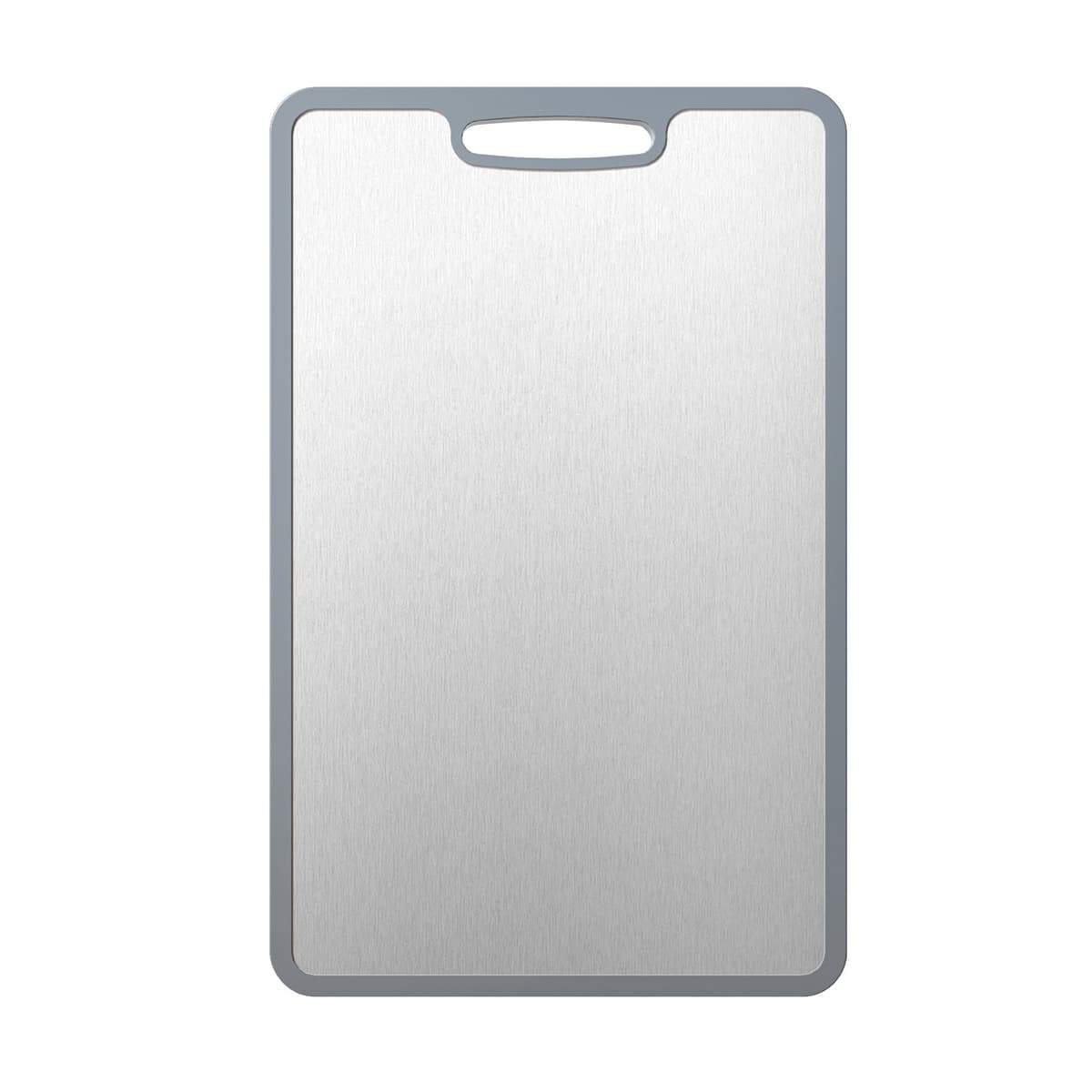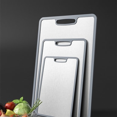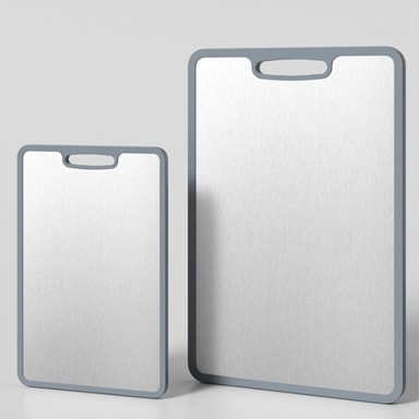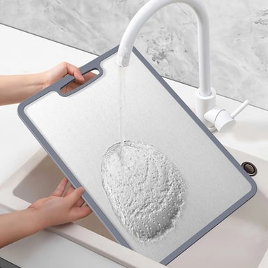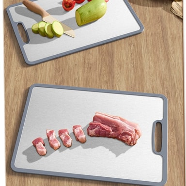 Dobbeltsidet alsidighed: Dette dobbeltsidede skærebræt tilbyder alsidighed til forskellige madlavningsopgaver. Brug den ene side til råt kød og den anden til grøntsager eller tilberedt mad for at forhindre krydskontaminering. Den glatte rustfri ståloverflade er skånsom mod knive og hjælper med at bevare deres skarphed over tid. Dette design maksimerer brættets funktionalitet og forlænger dets levetid, hvilket gør det til en praktisk og effektiv tilføjelse til ethvert køkken. Nyd bekvemmeligheden ved at have to forskellige overflader til forskellige madtyper, hvilket sikrer optimal hygiejne og organisering.