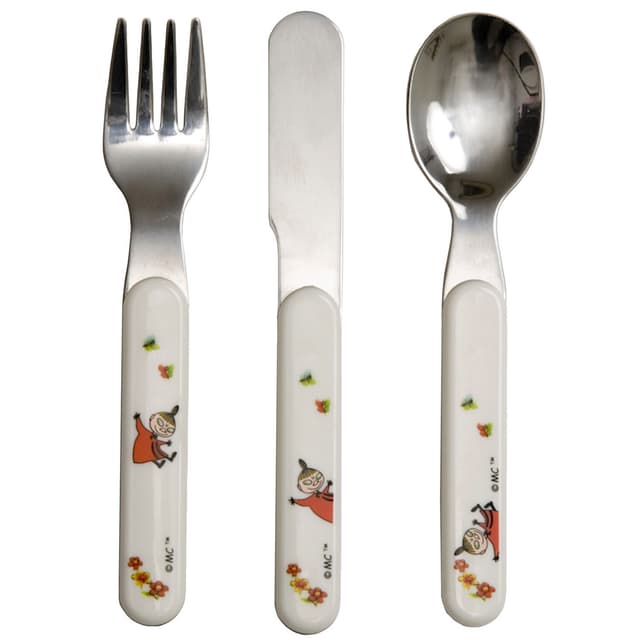 Bestik Mumin i tre dele, indeholder gaffel, kniv og ske. Afrundede plasthåndtag af melamin. Perfekt bestik til børn, der lige har lært at spise selv. Leveres i praktisk gaveæske.