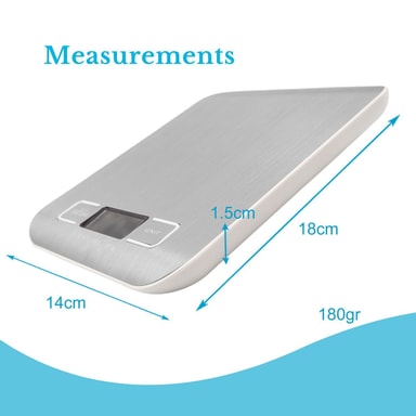 - Drives med 2x AAA-batterier - Letlæselig LCD-skærm - Dimensioner: 20,5 x 16,5 x 3 cm - Vægt: 302 g - Slukker automatisk efter 1 minut - Kan bestemme nettovægt - Forskellige vægtenheder - Vandafvisende