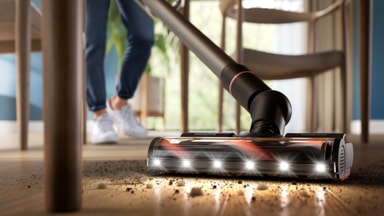 TriActive Smart LED-dysen tilpasser sugeevnen automatisk baseret på gulvtype. Indbyggede LED-lys fremhæver skjult støv, hvilket gør det muligt for støvsugeren at opsamle mere snavs i én enkelt passage.
