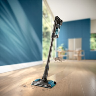 Philips 8000 Series SpeedPro Max Pet ledningsfri støvsuger XC8155/01 tilbyder op til 80 minutters driftstid, anti-hår teknologi, kantrengøring og et støvsuge-og-moppe Aqua mundstykke til hurtigere rengøring.Læs mere om produktet