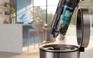 Støvbeholderen har en-trykstømning, der gør det muligt at frigive snavs hygiejnisk uden at fjerne beholderen eller røre ved affald.