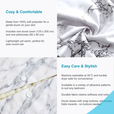 Sættet består af et dynebetræk (135x200 cm) og et pudebetræk (80x80 cm). Det er ideelt til hjem, hoteller og vandrehjem.